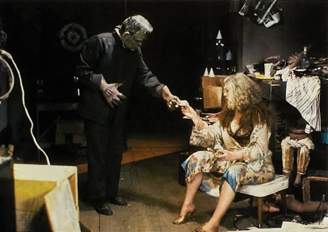 In between heavy kissing, pot smoking and whatever, they hear noises coming from the floor below. Looking down between floorboards, they see into a room where the fortuneteller lady is granting sexual favors to the son of the funhouse barker (for money of course). The adult son, who speech is limited to grunts and howls, chooses to keep his face hidden in a Frankenstein mask. Right away, the spying kids and the viewing audience can tell that there is something not quite right with this guy in the mask.