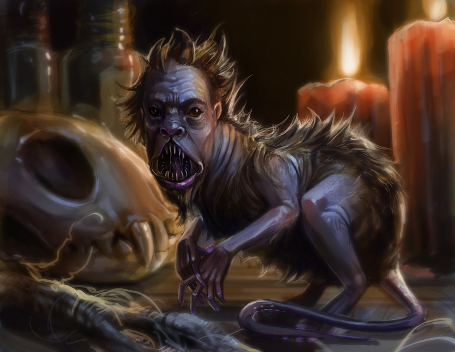 Witnesses said it had long hair and the shape of a rat, but that its sharp-toothed, bearded face was evilly human while its paws were like tiny human hands. It took messages betwixt old Keziah and the devil, and was nursed on the witch’s blood—which it sucked like a vampire. Its voice was a kind of loathsome titter, and it could speak all languages